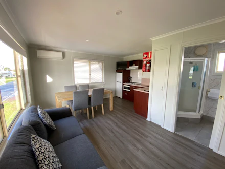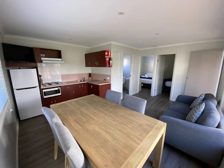2 Bedroom Cabin, Bedroom 1 has a queen bed and Bedroom 2 has a Queen bed. Fully Equipped Kitchen, Ensuite Shower and Toilet, Air-conditioning/Heating, Dining table, Lounge, Television Linen Supplied