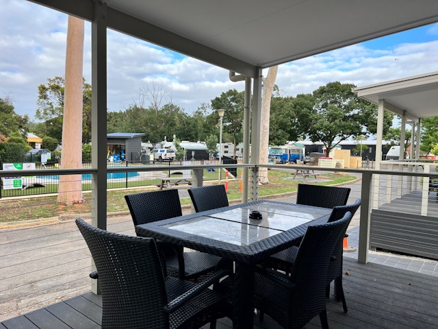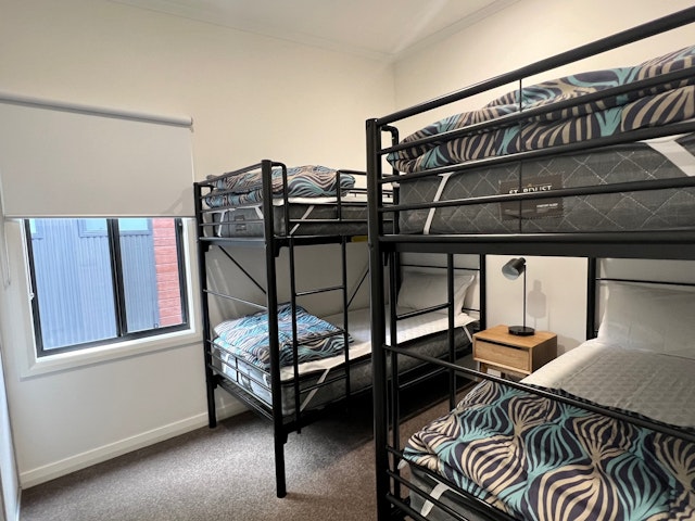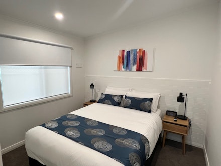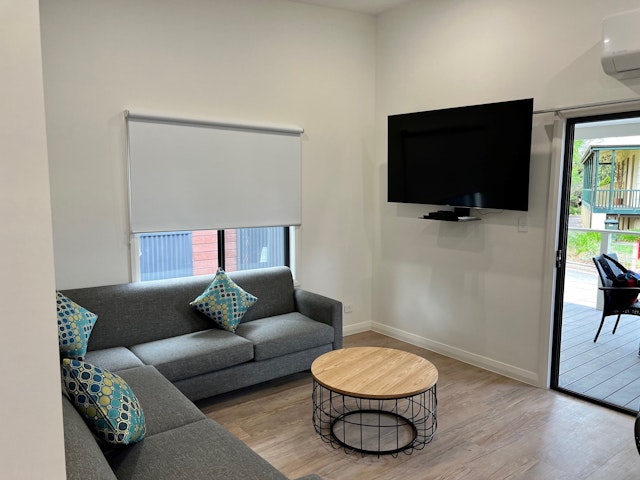 This 2-bedroom cabin sleeps up to 6 people, with linen provided for all beds. It features a queen bed and 2 sets of bunks. The cabin is fully self-contained, including reverse cycle air-conditioning, an ensuite bathroom with a separate toilet, and a large undercover deck with seating. Amenities include a TV, gas cooktop with under-bench oven, microwave, lounge and dining area, hairdryer, iron, and ironing board.