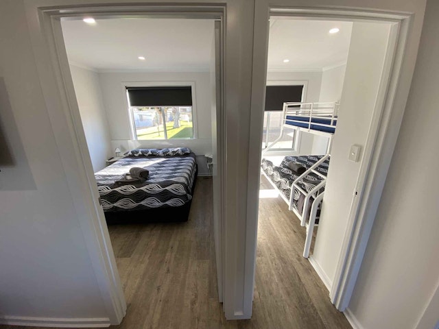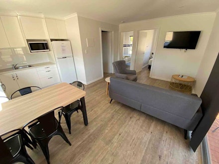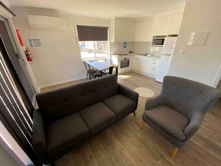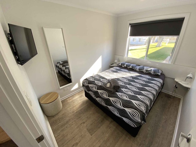 Spacious and modern 2 Bedroom Villa that can sleep up to 5, equipped with LCD TVs in the lounge and main bedroom, a fridge, toaster, kettle, and a selection of cutlery, pots, and pans. All necessary linen is provided, with the queen bed being the only one made up. Additionally, there is a split system air conditioning for comfort. Irons and ironing boards can be obtained from the office.