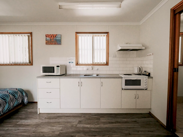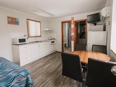 Open plan Ensuite cabin that can sleep up to 5, equipped with LCD TV in the lounge and main bedroom, a fridge, toaster, kettle, and a selection of cutlery, pots, and pans. All necessary linen is provided, with the queen bed being the only one made up. Additionally, there is a split system air conditioning for comfort. Irons and ironing boards can be obtained from the office.