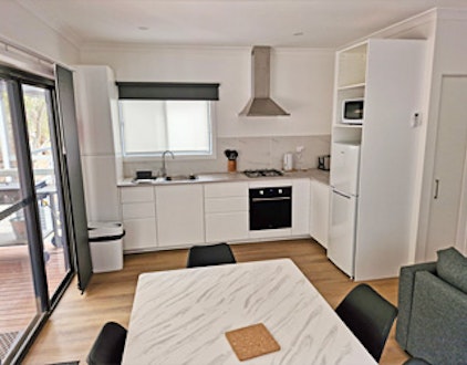 This cabin includes a main bedroom with a queen bed and TV, and a second bedroom that can be set up with either split singles or a joined queen. It also features a lounge with a sofa bed, TV, kitchen and dining area, an ensuite, and an outdoor deck with a BBQ for dining. Linen is included for your stay.