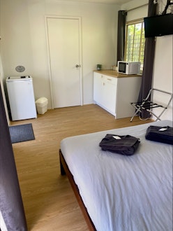 Incredibly cozy and inviting, our studios have modern furnishings and are perfect for a couple looking to enjoy their own slice of Spear Creek. The Studios Include 1 queen bed, ensuite, kitchenette (microwave, toaster, kettle & mini fridge) air-conditioning, TV, fire pit, shared deck with BBQ & outdoor dining. Shared full-kitchen facilities located within walking distance. Parking beside the cabin for one vehicle. Linen supplied. Pet friendly with additional charge - Please confirm pets with Reception prior to booking.