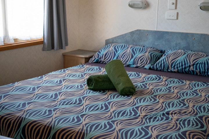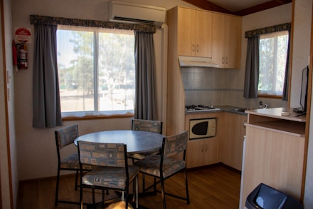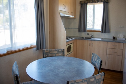 These cabins include a living area with a lounge and kitchenette. The kitchenette has cooking utensils, crockery, cutlery, bar fridge, gas cook top, and a microwave. There are two separate bedrooms, one with a queen bed and the other with a double bed, both with ceiling fans. Each cabin is equipped with televisions and split system air conditioning.