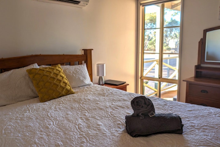 The Cottage includes an open plan living space with fully equipped kitchen, living, dining and bathroom areas. It has three bedroms with double beds, each with ceiling fans and split system air conditioning throughout. There is a compact laundry with a washing machine. Outside there is a gas barbeque, washing line, campfire area and undercover parking.