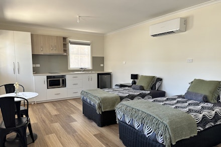 These cabins are open plan with a queen bed, kitchenette and ensuite. The kitchenette has cooking utensils, crockery, cutlery, bar fridge, gas cook top, and a microwave. Each cabin is equipped with a Television and split system air conditioning.