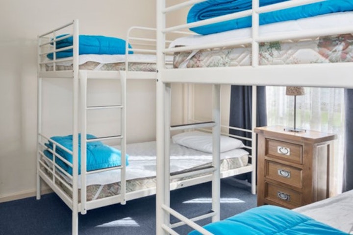 Set beside the pool in a lush grassy area, this two-bedroom cabin comfortably sleeps up to six with a queen bed and two sets of bunks. The self-contained kitchen includes a gas oven, stovetop, microwave, and full-size fridge. Relax in the air-conditioned living and dining areas or enjoy meals outdoors on the covered deck. With a modern bathroom and all the essentials, it’s a fantastic choice for families seeking fun and convenience.