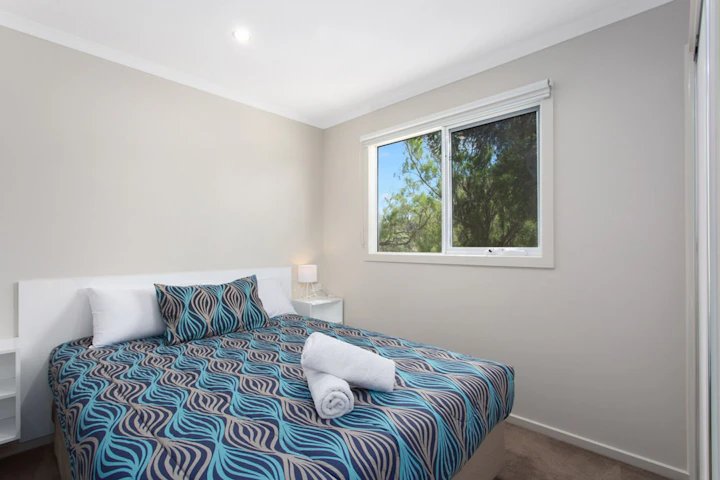 Ideal for families and groups, this modern three-bedroom cabin sleeps up to eight with two queen beds and two sets of bunks. The self-contained kitchen features a cooktop, fridge, and microwave, while the spacious lounge and dining areas provide comfort for all. Stay cool with air conditioning and enjoy outdoor dining on the undercover deck. Positioned near a large grassed area, it’s perfect for relaxed coastal stays with room to unwind.