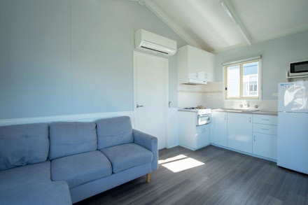 This two berth unit is fitted with a queen size bed and traditional en-suite. This unit is completely self-contained, with a fully equipped kitchen including a stove, oven, grill, microwave oven and fridge. There is also a flat-screen TV, DVD player, lounge, and a cozy two-person spa in the bathroom! Everything you need for a romantic getaway.