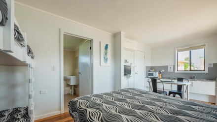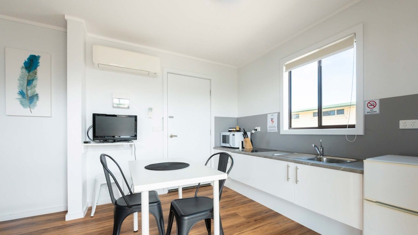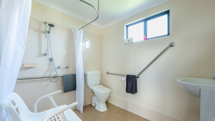This accessible unit offers a Queen Bed and a set of Bunks with all linen included (sleeps 4) and are also pet friendly. They have an accessible shower and toilet with rails along with a shower chair, fully equipped lowered kitchenette with bar fridge, TV, and reverse cycle air conditioning.