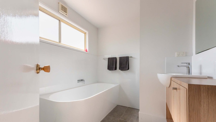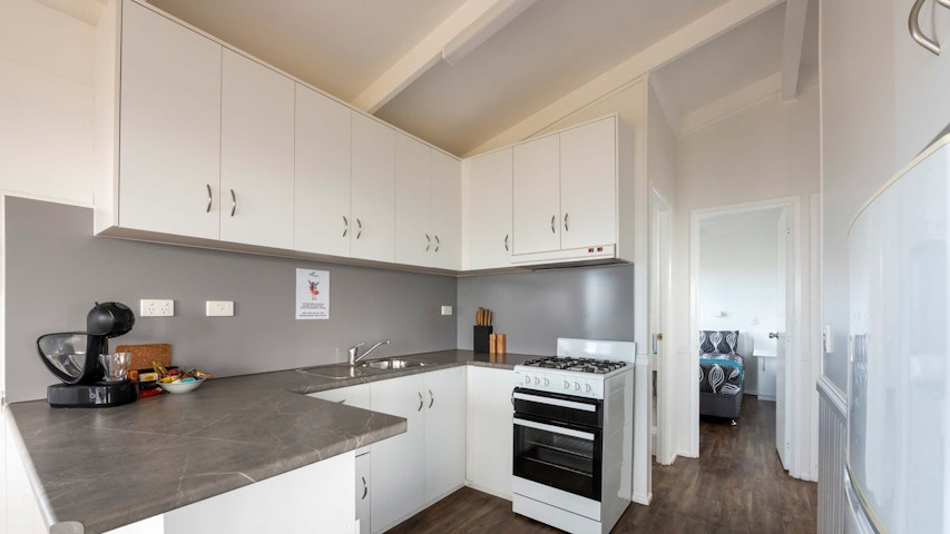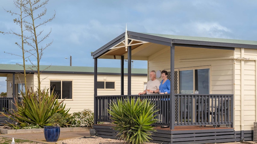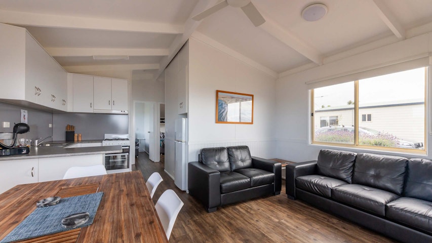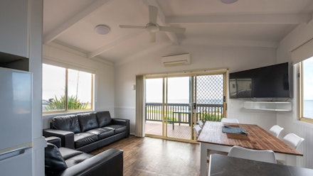 These two bedroom cabins sleep up to 5 or 6 guests with a Queen bed in the main bedroom and a choice of a Queen + Single bed or 2 sets of Bunks in the second bedroom with all linen included. They offer a full kitchen, shower and bath with a separate toilet, furnished verandah, large lounge area with dining table overlooking the ocean, sofa with TV and reverse cycle air conditioning.
