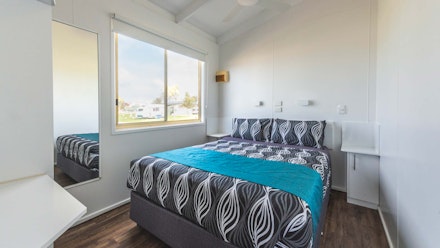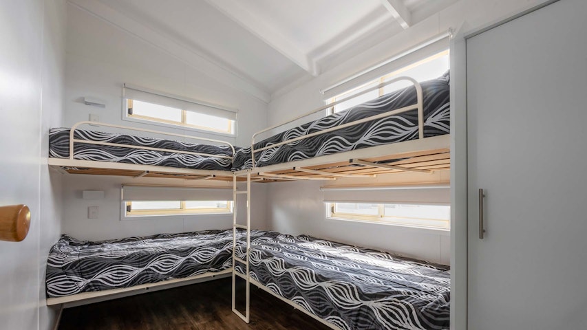These two bedroom cabins sleep up to 6 guests with a Queen bed in the main bedroom and 2 sets of Bunks in the second bedroom with all linen included. They offer a full kitchen, shower and bath with a separate toilet, furnished verandah, large lounge area with dining table overlooking the ocean, sofa with TV and reverse cycle air conditioning.