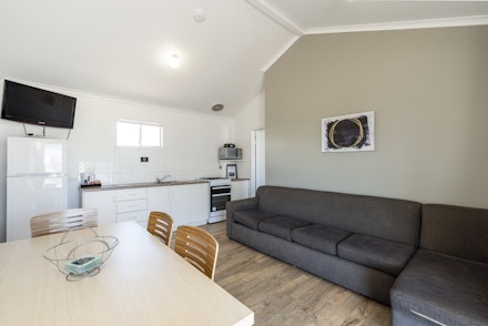 The living area is furnished with a table and chairs for 6 people, 2 seater lounge, TV and reverse cycle air conditioner. The kitchen is well-equipped. Linen included for all beds.