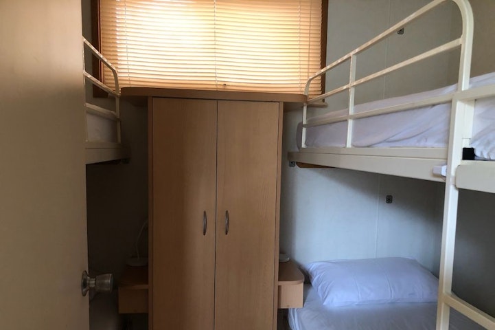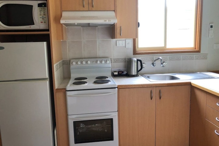 Main bedroom room has a queen bed and two sets of bunks in the second bedroom. Also features a full kitchen, living, dining area and bathroom. Verandah with outdoor setting.