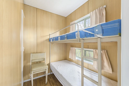 SLEEP 5 Double bed in the living area Set of triple bunks in separate room No bedding supplied Fully self contained kitchen Fridge Microwave Split system LCD TV Very clean and tidy Ideal for budget travellers