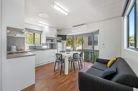 Our two bedroom cottages are a great budget cabin with everything you need for a reasonable price. The cottage offers a small lounge area and a 2 seater sofa. There is no balcony in this cabin. With a double bed in the master room and two sets of single bunk beds in the second bedroom.The bunk beds in the second bedroom are a shorter length than a standard single bed and would be suitable for children age 12 and under. Linen provided for the number of people included in the booking. Cottage includes: electric blanket on main bed, microwave, oven fridge, kettle, toaster, crockery, cutlery, pots and pans, split system heating .