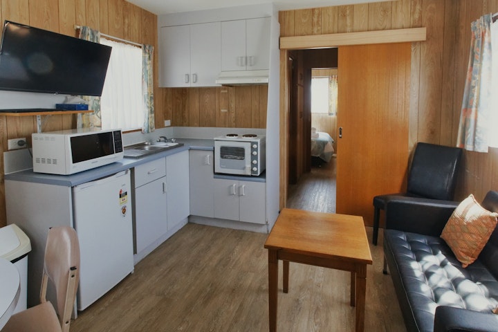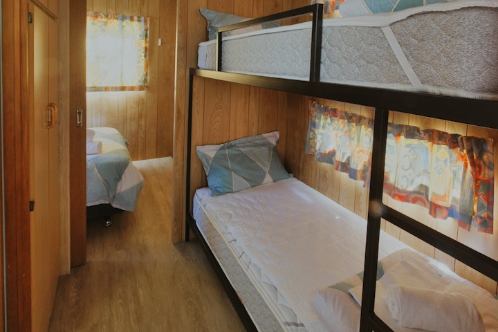 Two bedroom cabin with 1 x Queen Bed plus two sets of Bunks. Sleeps up to six persons. Stove, microwave, toaster, tea and coffee supplies, free wifi and located in a quiet off street location.