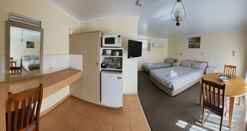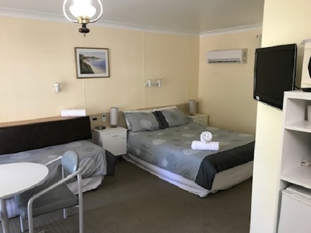 Superior Room with 1 x Queen Bed and 1 x Single Bed. The room includes a microwave, toaster, tea and coffee supplies, free wifi and located in a quiet off street location.