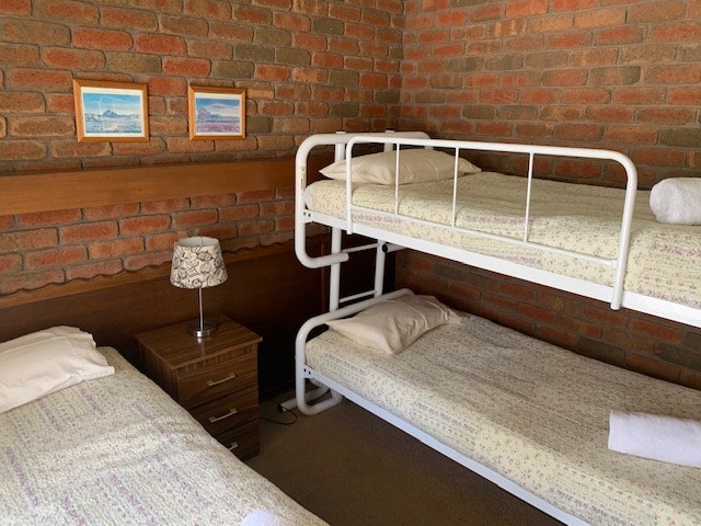 Two Bedroom Family Unit with a Queen Bed, 2 x Singe Beds and a Bunk Bed, suitable for up to six people. Microwave, toaster, tea and coffee supplies, free wifi and located in a quiet off street location.