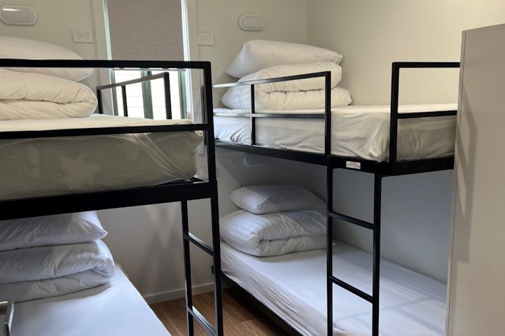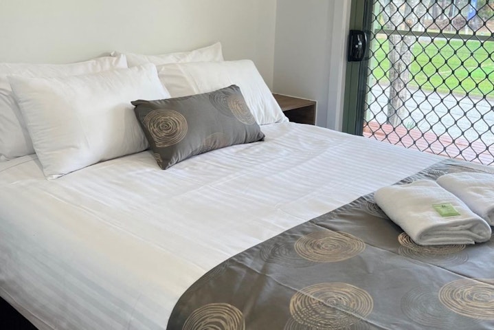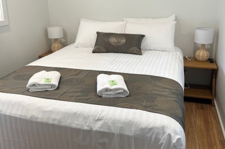 These Lakeview Villas can accommodate up to 8 people in three bedrooms making it perfect for a family or friends' group. Two bedrooms have the Queen beds made up with linen and towels supplied and the third bedroom has four single bunk beds. Bring your own sheets and towels for the bunk beds or hire linen packages for $10.00 each. Charge is $10.00 per dog/per stay. Dogs are not permitted to sleep on any beds in the cabins.