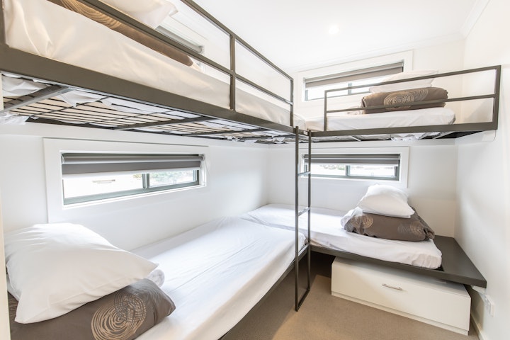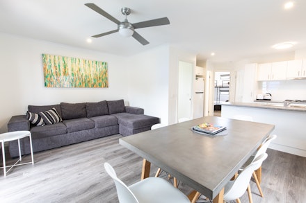 This two-bedroom villa sleeps up to six guests with a queen bed in the main bedroom and two sets of single bunks in the second. The open-plan layout features a full kitchen with gas oven, stovetop, microwave, and fridge, plus heating, cooling, and a TV. A private balcony with outdoor dining overlooks the pool or rockpool, just steps from the BBQ area and park facilities.