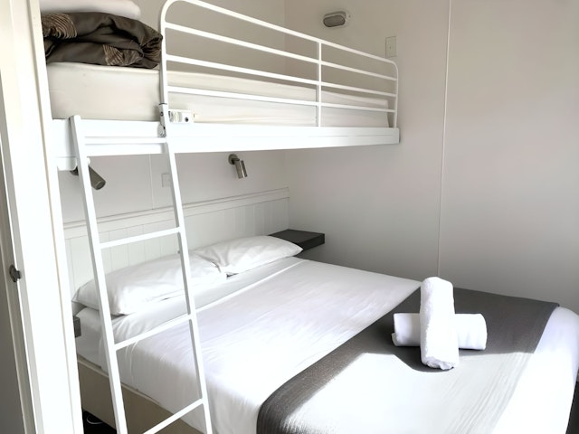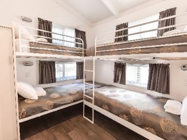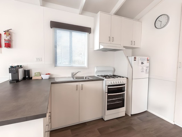 This spacious three-bedroom villa sleeps up to nine guests with a queen bed, two sets of single bunks, and a double bed with a single bunk overhead. The open-plan layout includes a full kitchen with gas oven, stovetop, microwave, and fridge, plus heating, cooling, and a TV. A large balcony with outdoor dining makes this an ideal base near the pool and BBQ area. Linen provided.