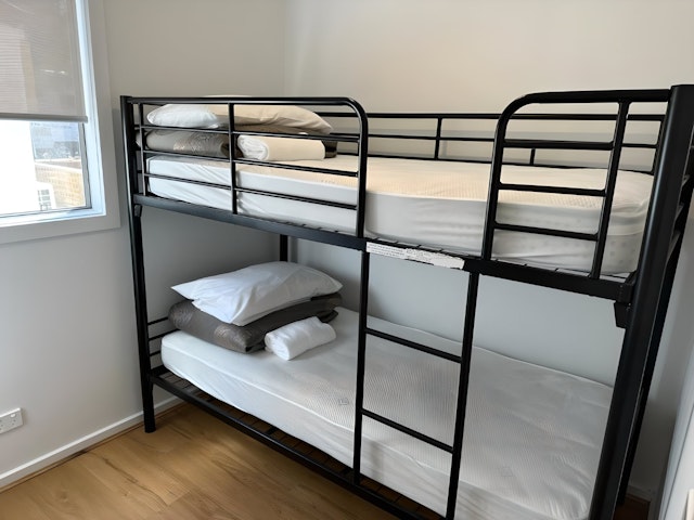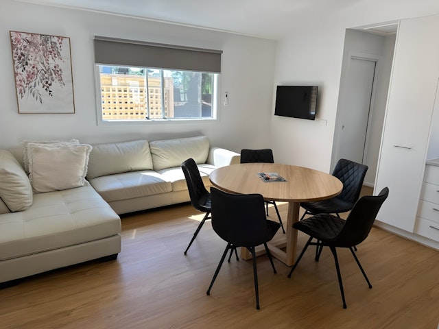 This three-bedroom cabin sleeps up to five guests, featuring a queen bed, a set of single bunks, and a single bed. The open-plan layout includes a full kitchen with a gas cooktop, electric oven, microwave, and full-size fridge, along with a dining area, lounge, TV, and reverse-cycle air conditioning. Outside, a private deck with outdoor seating offers a relaxing space just a few steps from park facilities. Linen provided.