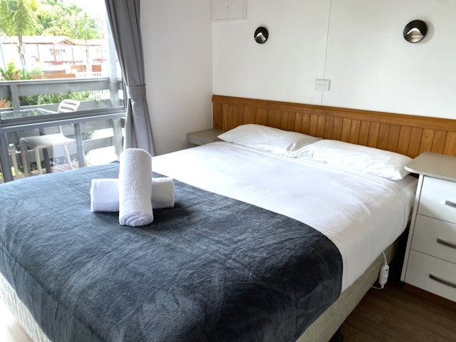 This two-bedroom cabin sleeps up to five guests with a queen bed in the main bedroom and double bed with single bunk above in the second. The open-plan layout features a full kitchen with gas oven, stovetop, microwave, and fridge, plus heating, cooling, and a TV. A private balcony with outdoor dining overlooks the pool or rockpool, just steps from the BBQ area and park facilities. Linen provided