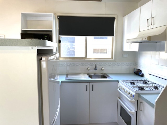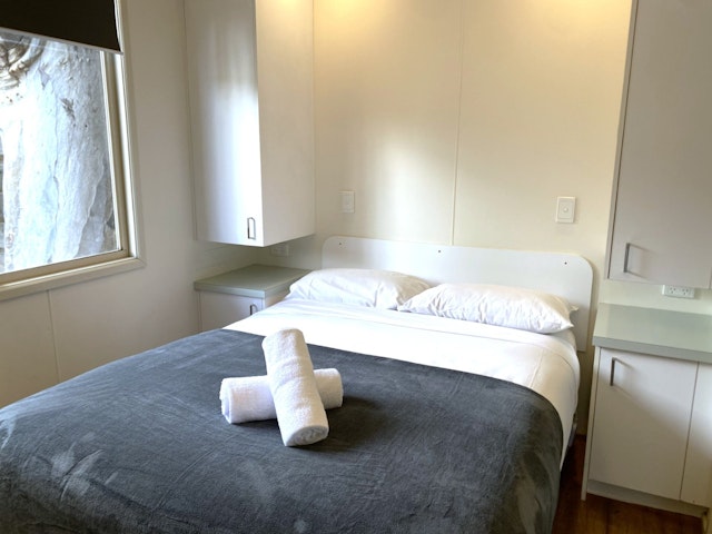 This two-bedroom unit sleeps up to four guests with a queen bed in the main bedroom and a set of single bunks in the second. It features a compact open-plan living area with reverse-cycle air conditioning, TV, and dining space. The kitchenette includes a cooktop, microwave, and full-size fridge.