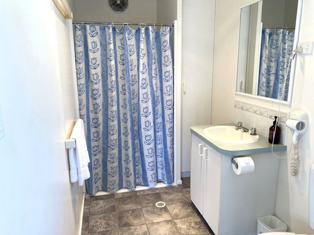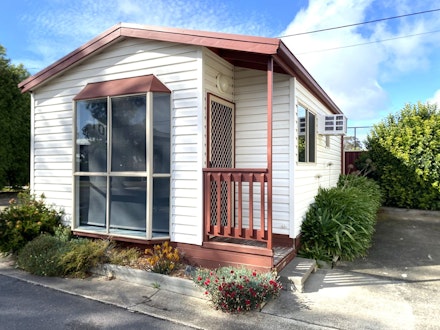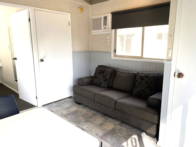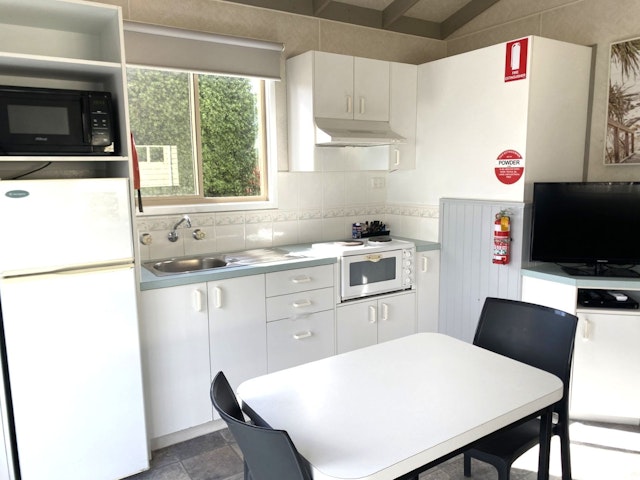 This one-bedroom cabin sleeps up to two guests with a queen bed and includes a practical open-plan layout. The kitchen features a cooktop, microwave, and full-size fridge, with a dining space, TV, and reverse-cycle air conditioning for comfort. Set close to park facilities, it’s a simple and affordable base for couples or solo travellers.