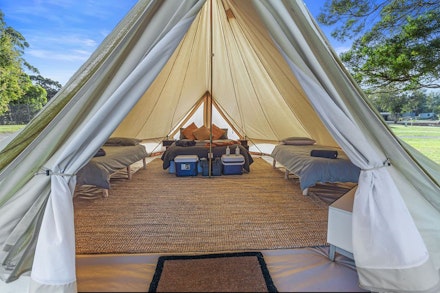 The larger family-sized tents are designed to comfortably sleep up to four guests. Each Pure Glamping Family tent includes a full queen-sized bed and two single beds, glassware, plates and cutlery and an esky to keep drinks and food chilled.