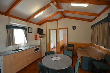 Modern cabin equipped with cutlery, crockery, cooking utensils, stove, oven, large fridge, microwave, LCD TV, DVD player. Reverse cycle air-conditioning (Heating & Cooling) and en-suite facilities (Toilet and Shower) within cabin. Outside deck area with table and chairs.Car parking beside Cabin.
