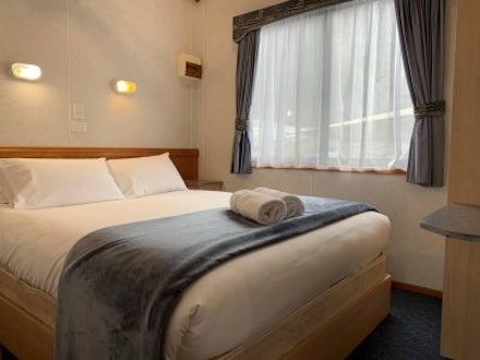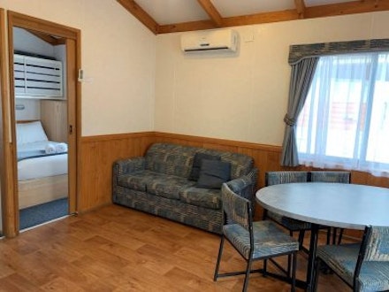 Our Deluxe Villas are fully self-contained. In the main living area, there is a TV, aircon, table and chairs and fully functional kitchen. The kitchen has a full-size fridge, microwave, kettle, toaster, cups, plates, utensils for all your cooking needs. It has two bedrooms one with a queen bed the other a double bed on bottom and single bed up top. As well as a bathroom with a shower and toilet. All linen is provided and free WIFI.