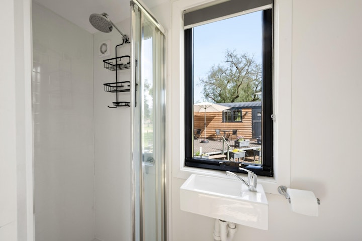 The Couples Shepherd's Hut is a single hut that has a queen bed. It contains a microwave, bar fridge, kettle, toaster and bathroom facilities inside the cabin. The Hut has a private balcony. The Hut is airconditioned and has a flat screen free to air TV. The outside deck has BBQ facilities, seating and shade. A fire pit is for guests use just off the deck area, with wood for sale on site.