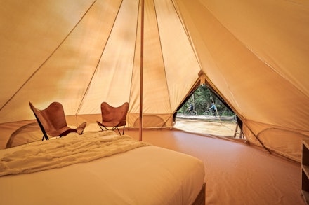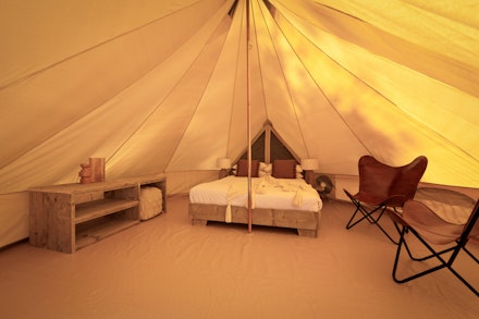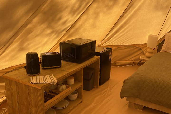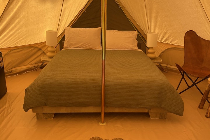 Limited to 2 people per room. 1 x Queen Bed. Glamping Tents are 5m x 5m, on a raised deck of 6m x 8m. Shared shower, toilet, and kitchen facilities.