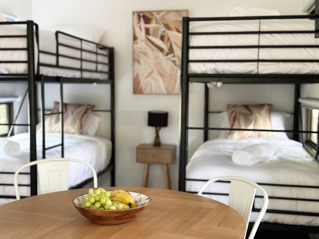 Cabin includes double bed and bunk beds, private balcony, small table and chairs, kitchenette with fridge, microwave and oven, reverse-cycle air conditioner for heating & cooling. Please note: This cabin does not have it's own bathroom. The nearby camp amenities offer excellent bathroom facilities that are kept clean and well-maintained for your convenience.