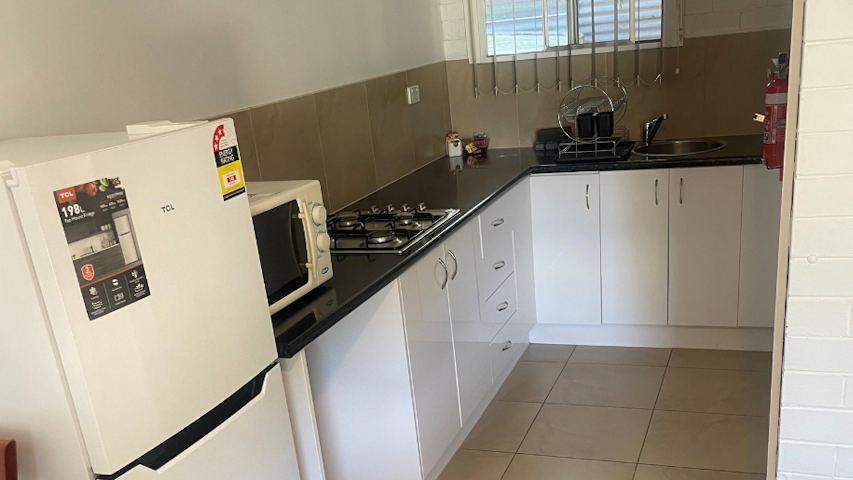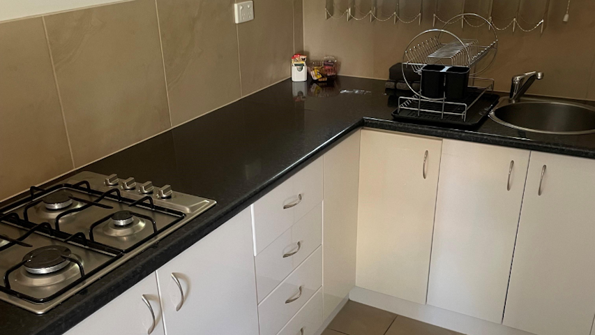 - Modern kitchen with gas stove, kettle, toaster, microwave, crockery & cutlery