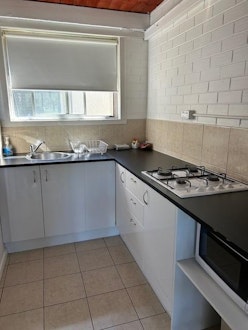 - Modern kitchen with gas stove, kettle, toaster, microwave, full fridge, crockery & cutlery