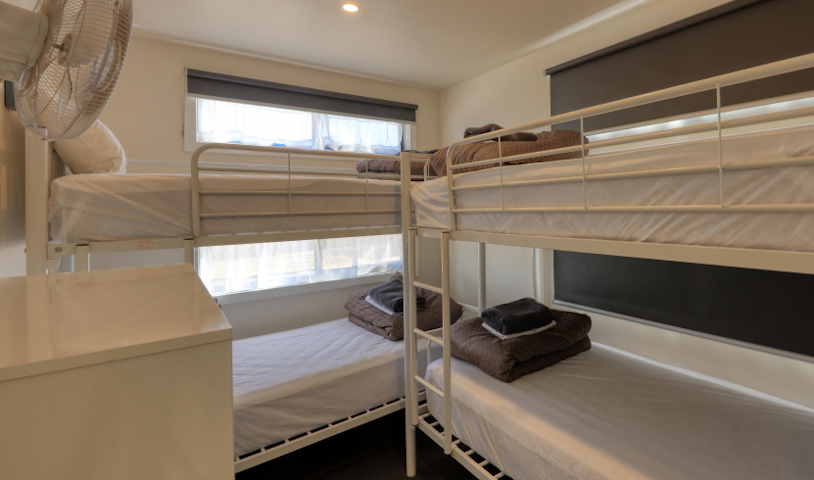 Brand New Waterfront Cabins with beach access to Lake Boga. With a modern fit out, this cabin features 2 bedrooms that includes a Queen bed and 2 sets of bunks, comfortable sleeping 6.