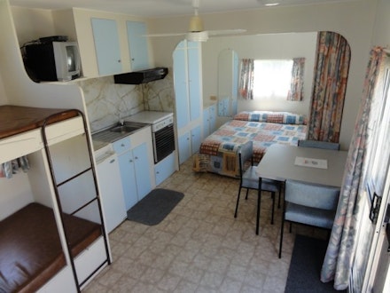 Open Plan, double bed, 2 or 3 bunks, kitchenette, colour TV DVD. Pillows supplied but