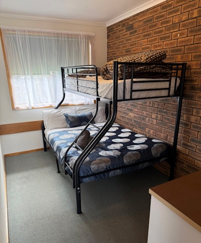 Self contained unit with queen and double with single over top. Kitchen, open plan living, new airconditioning, colour TV DVD, linen supplied, ensuite.