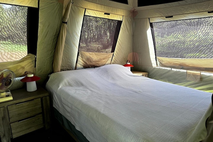Fully set up tent accommodation for two people with a full inner sprung queen size bed ensemble with bed side tables, camp lights, power for charging and an electric blow heater.