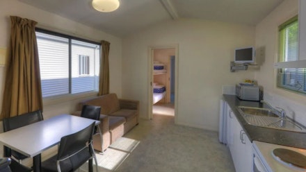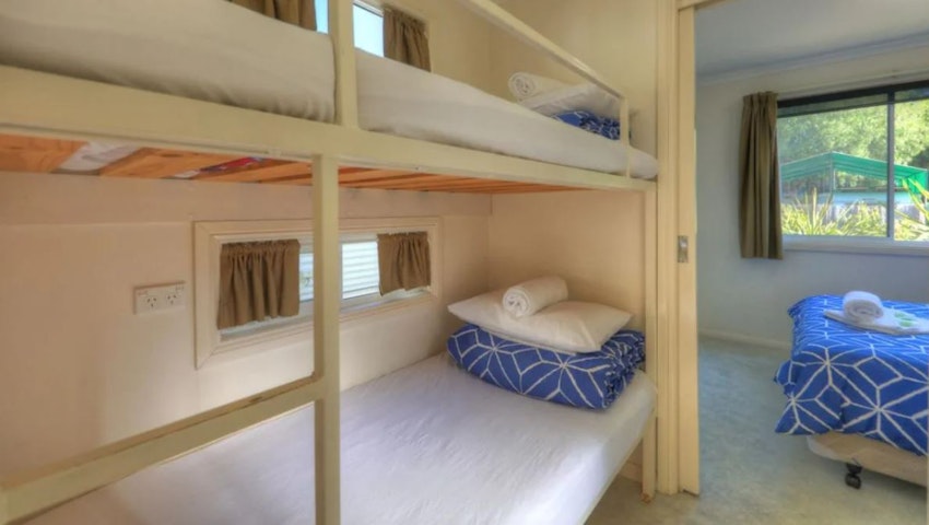 The One Bedroom Cabin includes: One Bedoom with one Queen Bed, One set of bunks. Bathroom and Kitchen - Heating and airconditioning,- Colour TV Not suitable for pets - Capacity for 2-4 guests