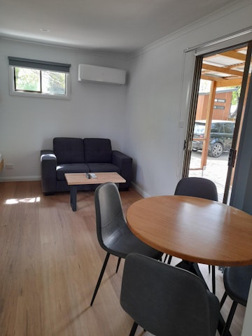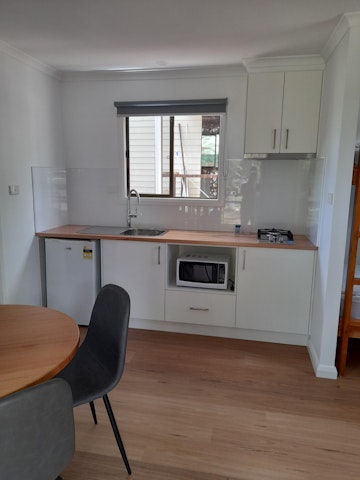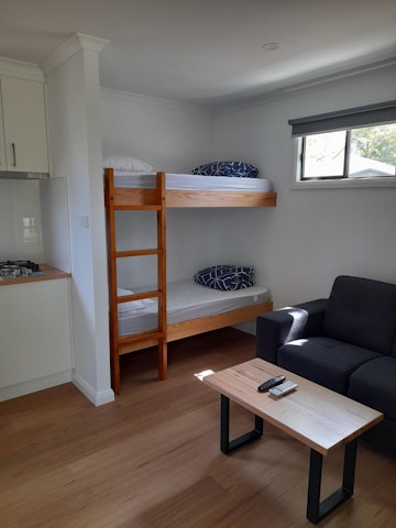 Our fully refurbished Wattle Cabins offer modern comfort and convenience, ideal for a single traveller, couple or small family. There is a double bedroom and a set of bunks to the rear of the lounge area.