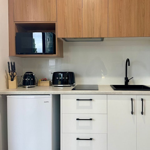 - Kitchenette with 2-zone induction burner, microwave & minifridge