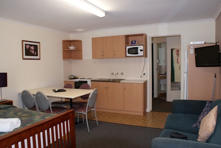 Situated overlooking the Garden & BBQ area, these apartments have a Queen bed in the living area and a separate bedroom with one set of bunks and 1 single bed. Dining table & couch provide comfort while the Kitchenette facilities allow you to put together a meal. Internal bathroom, TV, DVD player and heating & cooling, compliment the apartment. All linen supplied. This apartment can accommodate a portacot. Initial Rate is based on Double. Twin share is available, please call reception.