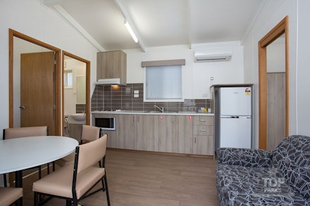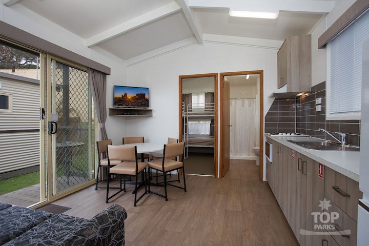 Modern, 6 person, Superior Cabin. Spacious Master Bedroom with Queen Bed and plenty of storage space. Separate 4 person Bunk room with natural light. Linen and towels are provided to the master bed only, BYO Bunk bedding. Functional, self-contained Kitchen, combined with comfortable seating for TV viewing. Split system Heating and Cooling & Ensuite.