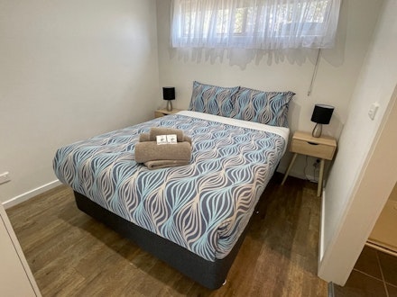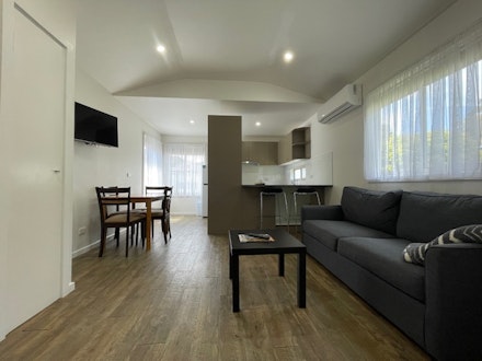 This modern 1 bedroom cabin is fully equipped with ensuite and Queen bed. Kitchen with fridge/freezer, convection microwave, cooktop, cutlery, crockery, Dining table and Reverse Cycle Air Conditioner. The lounge area a large T.V. sofa which can made into a Queen bed with innerspring mattress (Linen can be provided for a fee) The entrance has a covered deck and outdoor setting.