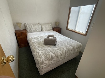 This cabin is fully equipped with double bed in the main bedroom and 2 single beds in second bedroom. All beds are made and rooms have built in robes. Full size kitchen with fridge, microwave oven and cooktop, cutlery, crockery and a Dining suite. The bathroom area is separate with toilet, shower and vanity, towels for 4. The lounge area a large T.V. and Reverse Cycle Air Conditioner. The entrance is a timber deck with an outdoor setting.