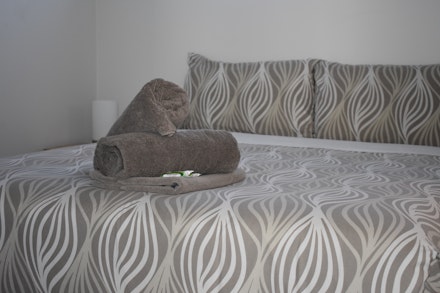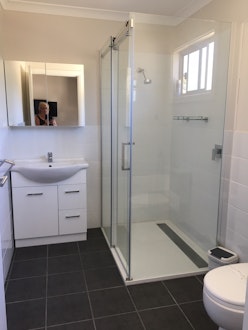 This modern spacious cabin is fully equipped with Queen bed in main bedroom and 2 single beds in second bedroom. Each bedroom has a T.V. All beds are made. Full size kitchen with bar fridge, convection microwave and cooktop, cutlery, crockery and a Dining suite. The bathroom area is separate with toilet, shower and vanity, towels for four. The lounge area a large T.V. and Reverse Cycle Air Conditioner and sofa which can made into a Queen bed with innerspring mattress (Linen can be provided for a fee). The entrance has a covered deck with an outdoor setting.