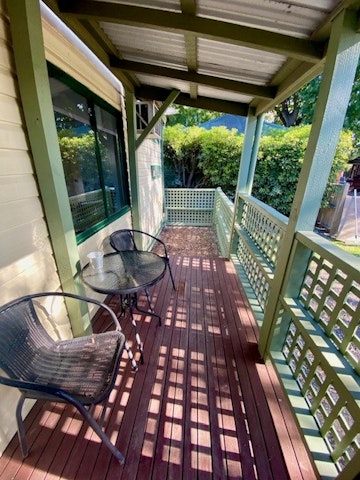 This en suite cabin sleeps 3 and has a double bed (studio) with a single bed in the area between main living area and en suite. Bedding, linen and towels are provided for all guests. The cabin has heating and air conditioning, TV and DVD player, microwave, kettle, toaster, small electric oven and electric cook top, small sized fridge / freezer, pots, cutlery and crockery for 3 people. The cabin has a table and chairs with a small, covered veranda and an enclosed area, off the veranda, for pets. Car Park. Boat and Trailer Parking by arrangement only and subject to availability.